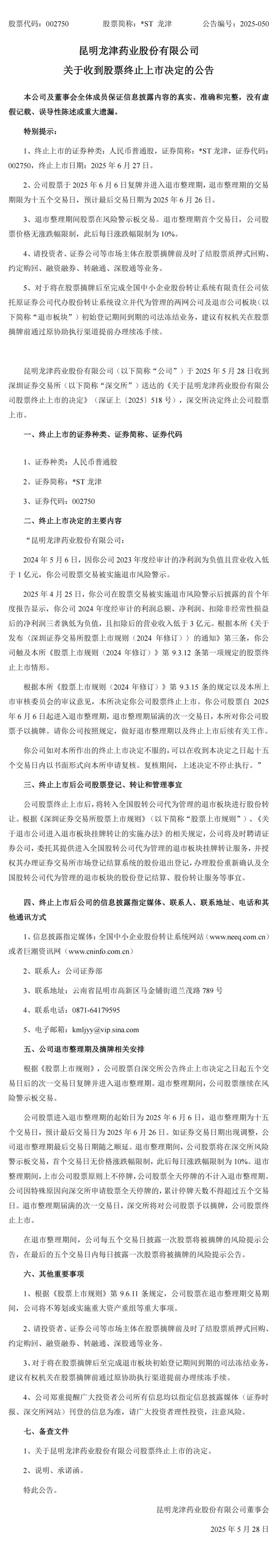 根据深圳证券交易所网站公告,002750(*ST龙津)将于2025年6月6日起进入退市整理期交易,退市整理期为15个交易日,预计最后交易日期为2025年6月26日,交易期间上述公司股票全天停牌的不计入退市整理期。退市整理期间证券简称变为“龙津退”,股票进入退市整理期的首个交易日无价格涨跌幅限制,此后每个交易日的涨跌幅限制为10%,退市整理期届满后次一个交易日,深圳证券交易所对公司股票予以摘牌。