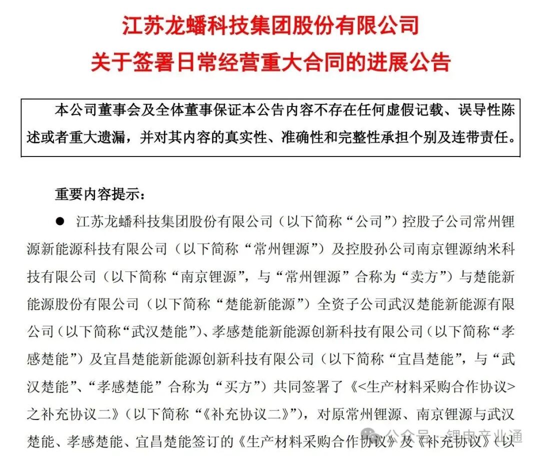 11月24日晚间,龙蟠科技公告称,公司控股子公司常州锂源及控股孙公司南京锂源(以下简称“卖方”)与楚能新能源全资子公司武汉楚能、孝感楚能及宜昌楚能(以下简称为“买方”)共同签署了《补充协议二》,对原协议相关条款进行补充与修订。